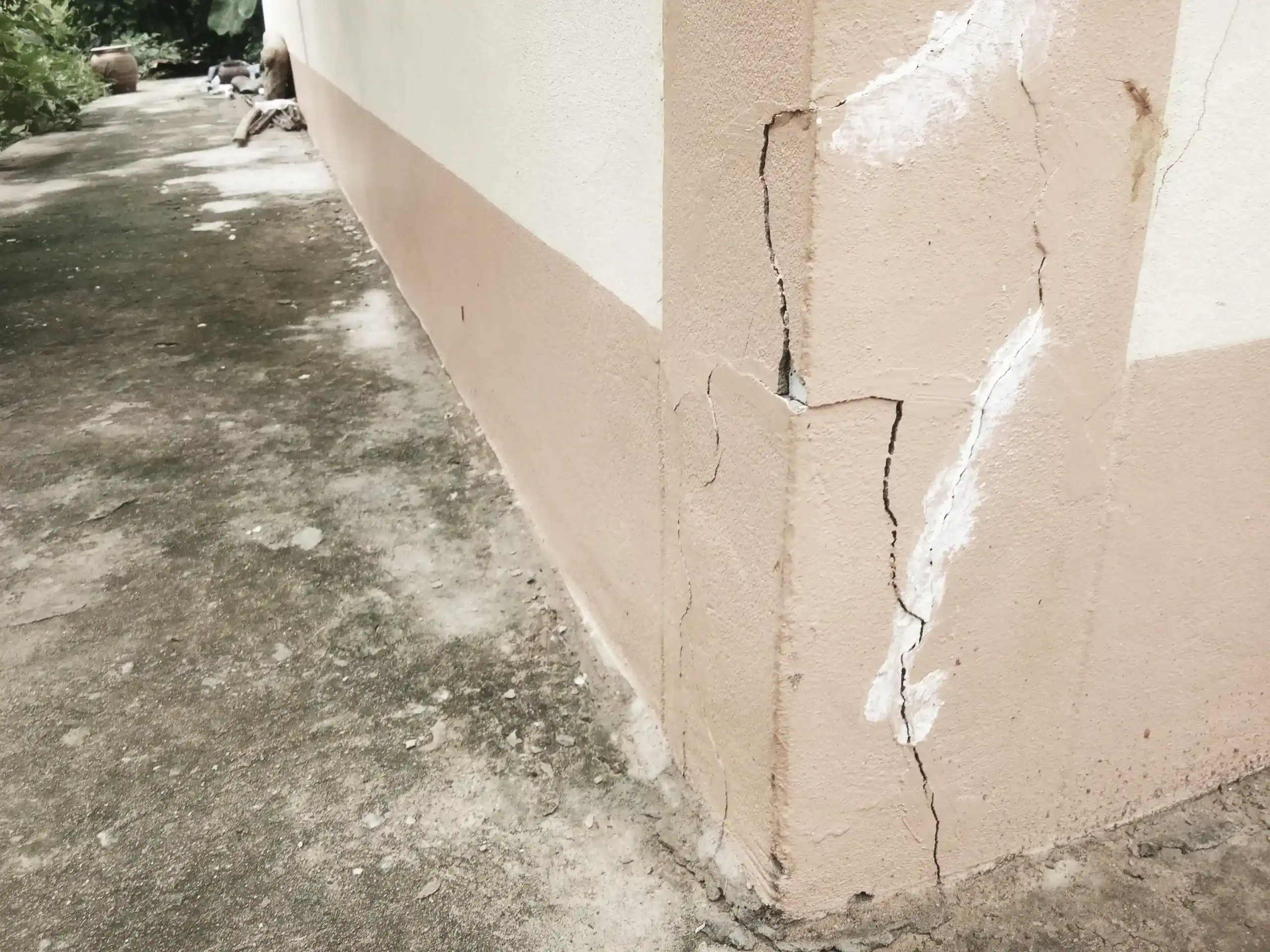 - รอยร้าวตามผนัง โดยเฉพาะรอยร้าวเฉียงรูปตัว V หรือร้าวต่อเนื่องจากวงกบประตูหน้าต่าง